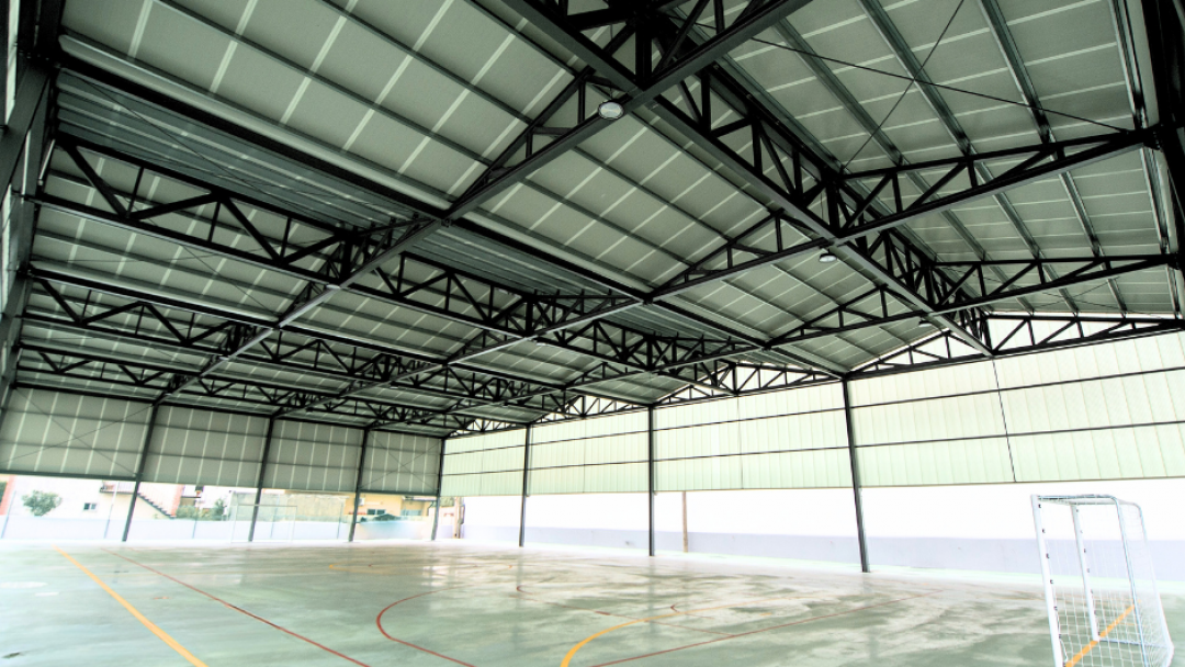 Execução de uma cobertura metálica com 1.500 m², projetada para assegurar as condições ideais de utilização do campo de jogos.