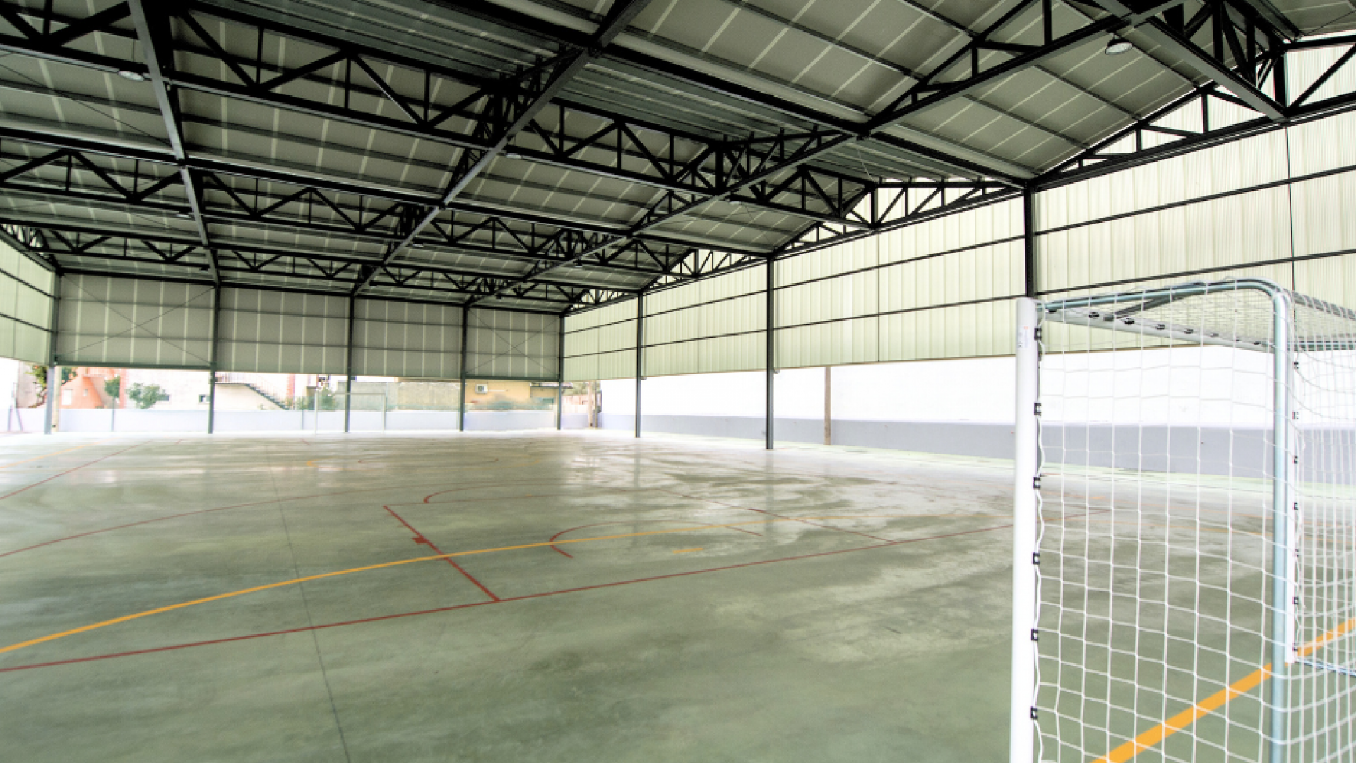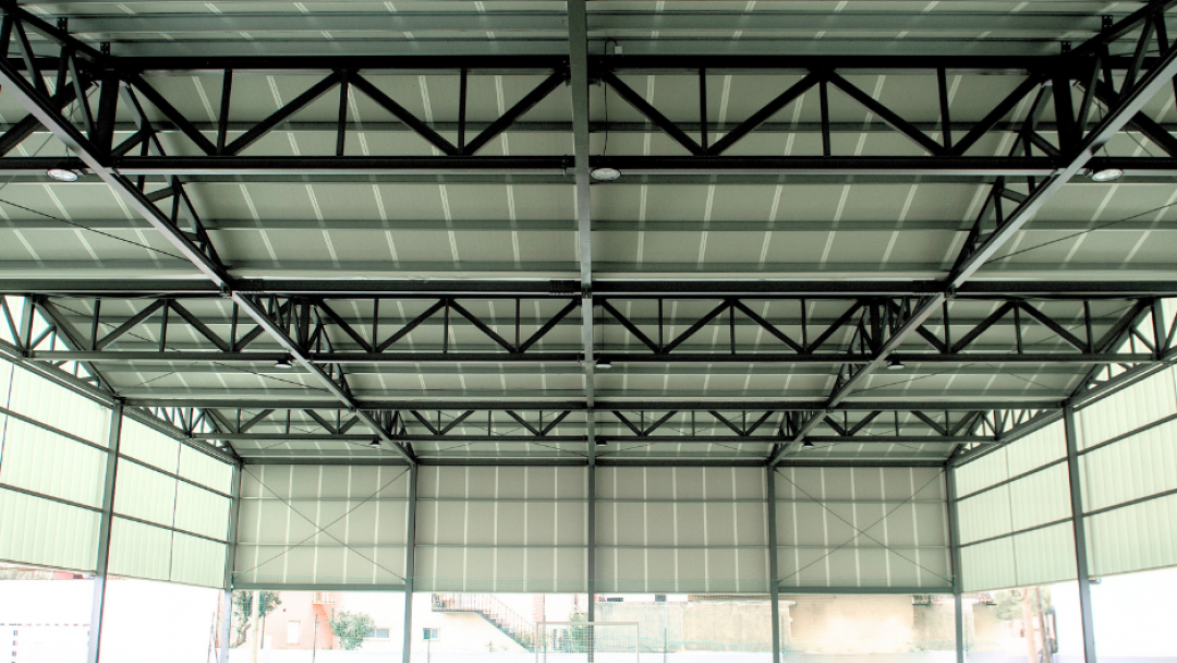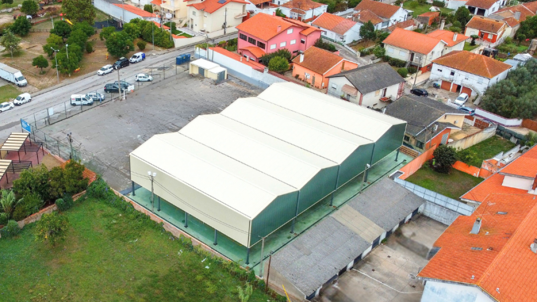 Execução de uma cobertura metálica com 1.500 m², projetada para assegurar as condições ideais de utilização do campo de jogos.